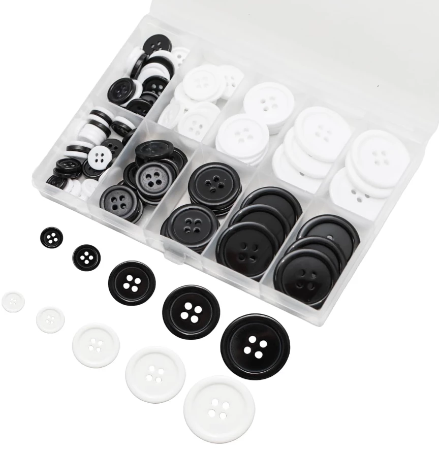 【Easy To Use】: These black & white buttons, made from eco-friendly resin, feature four buttonholes for easy stitching and strong, secure attachment that won’t come off,